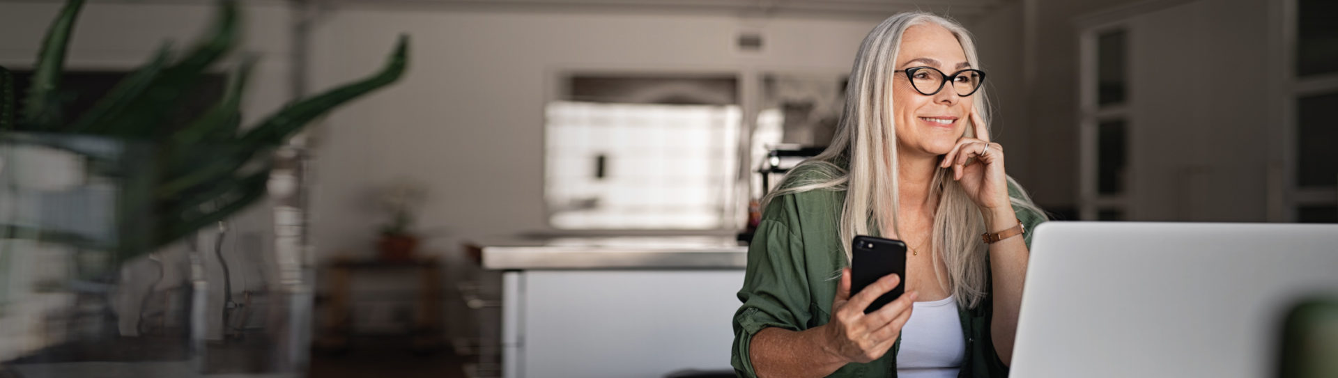Older adult female using laptop computer and smartphone with smile on face